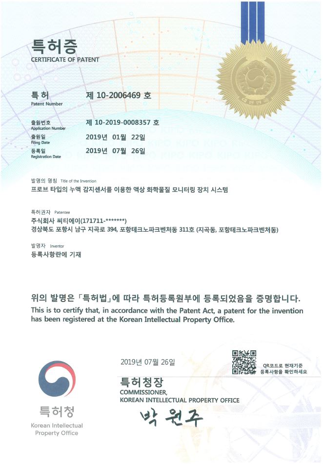 기술연구소 ( Tel.054-261-2568 / tech@cta-posco.co.kr)화학물질의 용액이 두개의 전극 사이에서 접촉 시 형성되는 임피던스값의 변위에 의해 누출되는 화학물질을 감지함